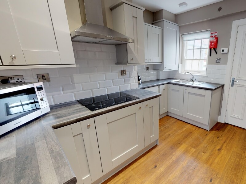 o Modern kitchen with hob, microwave oven, toaster, kettle